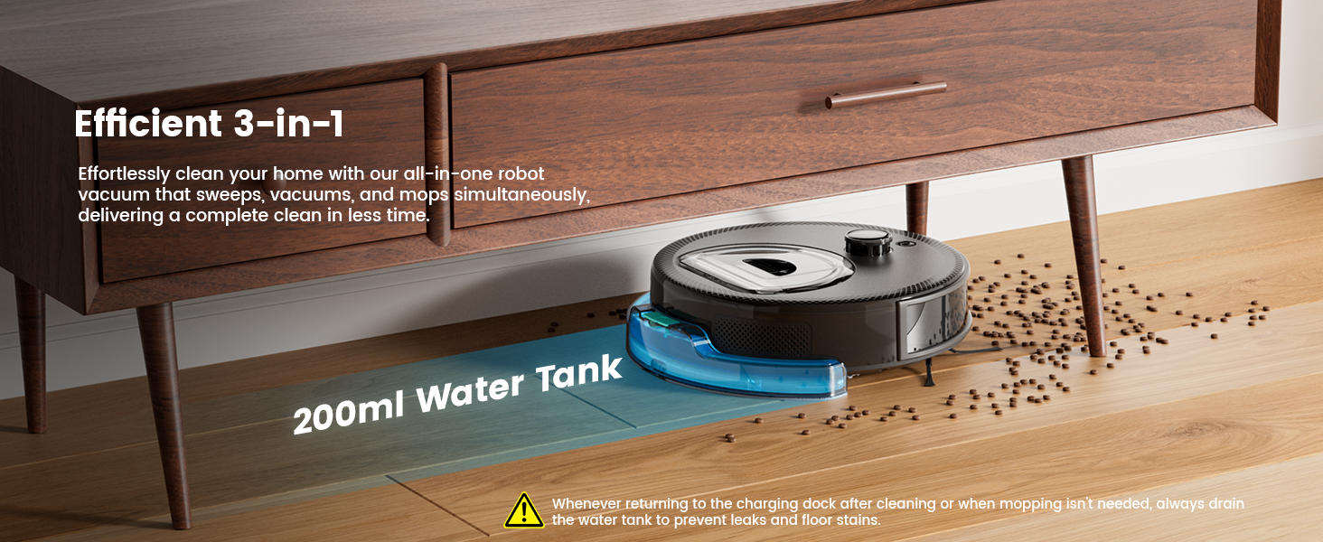 【Robot Vacuum and Mop Combo】Features a 200mL refillable water tank and a washable, detachable mop for effortless deep cleaning. ⚠Whenever returning to the charging dock after cleaning or when mopping isn't needed, always drain the water tank to prevent leaks and floor stains.